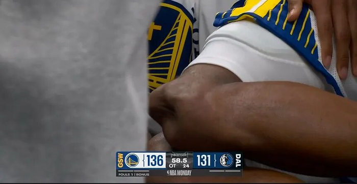 转播方不敢再给特写,信号直接切走,场边库里双手抱头,眉头紧锁,面色铁青,戴上了痛苦面具。