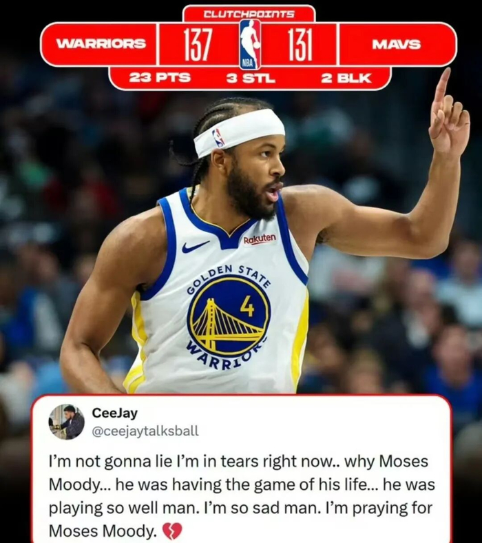 我跟你说,勇士独行侠这球看完,心里堵得慌。加时最后一分钟,穆迪抢断弗拉格,一条龙杀向空篮,这本该是锁定胜局的一球,是他复出首战最完美的收尾,可就在起跳那一下,无对抗,膝盖直接折了。