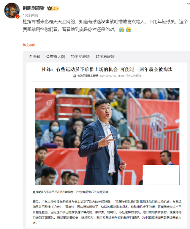 在对阵山西队那场比赛杜锋还在场边对着胡明轩破口大骂,一个暂停多次朝着胡明轩狂喷,杜锋对胡明轩的忍耐已经到达了临界点。