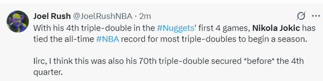 掘金记者乔尔-纳什:约基奇开赛前四场比赛都拿三双,这使得他追平了单赛季开局连续三双最多纪录,他生涯已经拿到第70次三节三双。