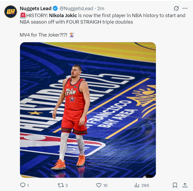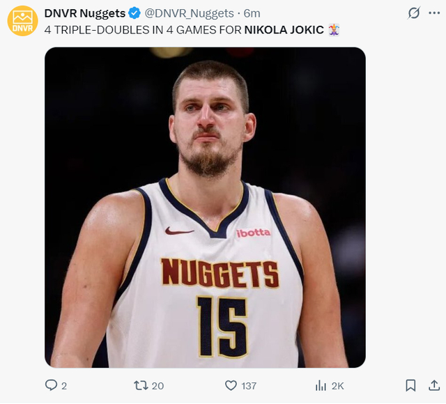 掘金媒体已经开始欢呼了,约基奇拿到连续四场三双: