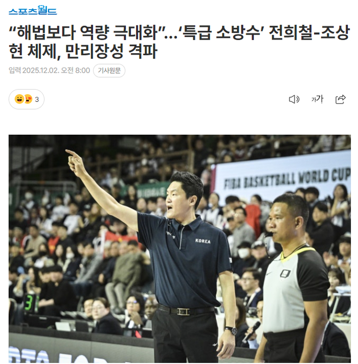 韩国媒体也盛赞了韩国男篮的临时主教练全熙哲,用李政炫的话来说他将所有人的能力都发挥到极致,或许战术、体系方面没有太大的改变,可球队的凝聚力、拼劲、求胜欲跟亚洲杯已经明显不同。
