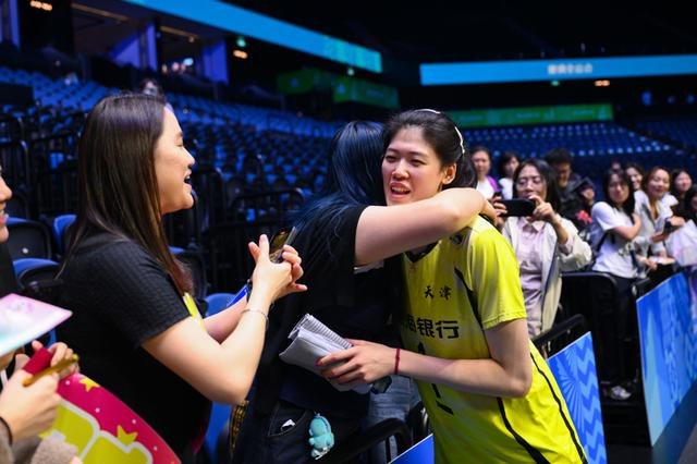 新华社照片,澳门,2025年11月18日 11月18日,天津队球员李盈莹(前右)在赛后与球迷互动。 当日,在澳门进行的第十五届全国运动会排球女子成年组5-8名半决赛中,天津队3比1战胜辽宁队。 新华社发(张金加摄)
