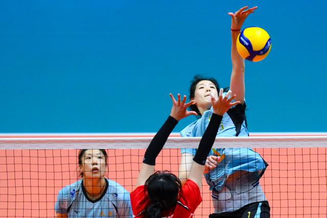 新华社照片,澳门,2025年11月19日 11月19日,天津队球员李盈莹(上)在比赛中扣球。 当日,在澳门进行的第十五届全国运动会排球女子成年组5-6名决赛中,天津队3比2战胜河南队,获得第5名,河南队获得第6名。 新华社发(张金加摄)