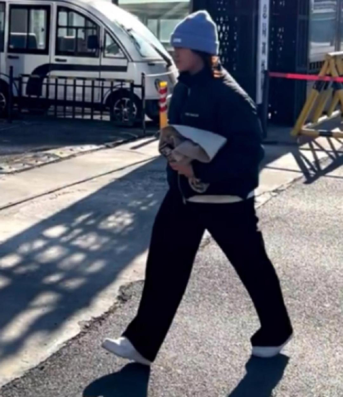 只见其从车上下来裹得很严实,头上戴着帽子,手里抱着围巾,穿着一身黑色棉服匆匆走来。