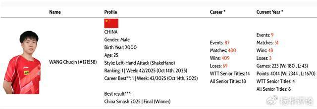 根据国际乒联官方数据,王楚钦今年打了51场比赛,48胜3负,胜率94.1%。而这个数据只包含世乒赛、世界杯和WTT的单打比赛。也就是说男双、混双都没算进去!而亚洲杯、亚锦赛、乒超联赛等赛事也没有纳入其中。