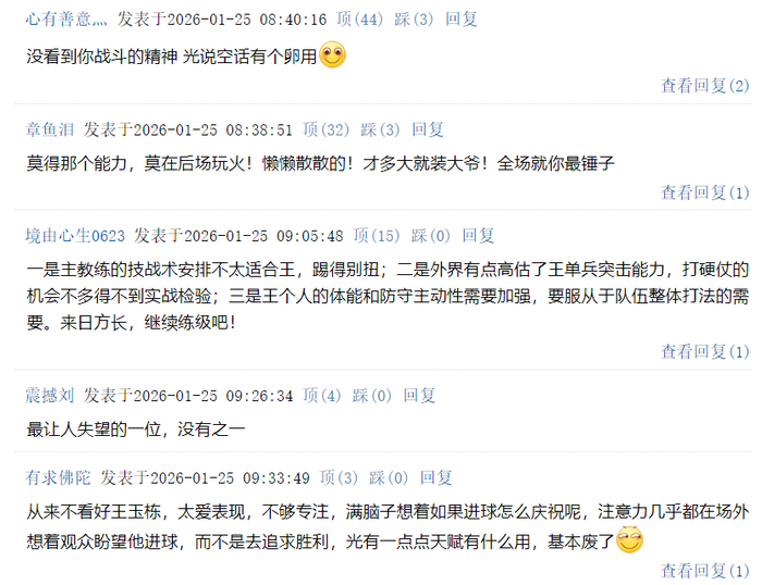 ——从来不看好王玉栋,太爱表现,不够专注,满脑子想着如果进球怎么庆祝呢,注意力几乎都在场外想着观众盼望他进球,而不是去追求胜利,光有一点点天赋有什么用,基本废了
