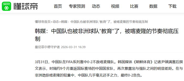 值得一提的是,韩国媒体《体育朝鲜》也对本场比赛进行了关注,赛后以“中国队也被非洲击败,面对无缘世界杯排名第45位的喀麦隆,上半场仅9分钟就奉上2球→0-2完败...被对方节奏完全压制”为标题,表示为0-4惨败科特迪瓦的韩国队找起了温暖。