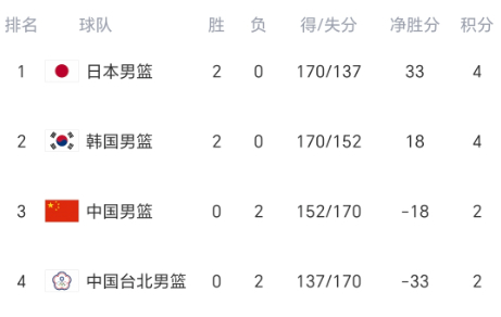 日本、韩国都是开局2连胜,日本依靠净胜分优势排名第一,韩国位列第二,中国队连续输球暂居第三,接下来两场分别对阵日本、中国台北,很大程度决定晋级下一阶段的命运。