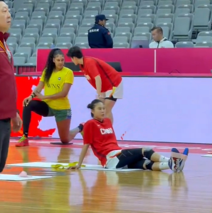两队赛前的热身,杨舒予已经跟对手聊起来了。
