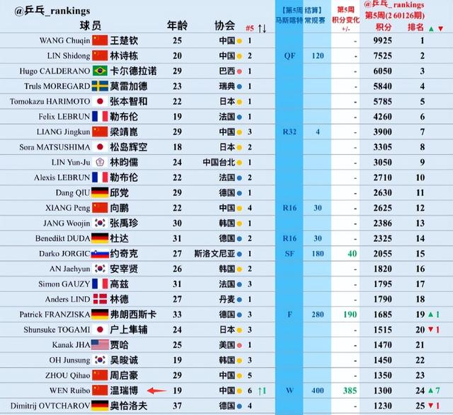 温瑞博在2026赛季开启之前他的世界排名仅仅第53,随着多哈球星挑战赛亚军,马斯喀特常规挑战赛冠军后,他的世界排名已经升至第24位,他已经反超了37岁的德国老将奥恰洛夫,世界排名进入前25也是温瑞博职业生涯新高。