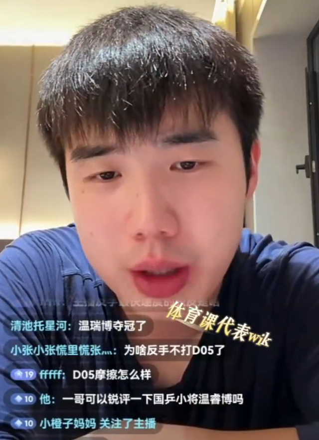 于何一在直播间谈到温瑞博时,这样说道:就目前来讲,国乒男队里面温瑞博的培养价值仅次于林诗栋,他可以排在目前国乒第四号、第五号的位置就这么简单。