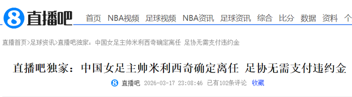 其中,该媒体指出去年,中国女足0-8惨败英格兰女足之后,米利西奇开始遭遇了下课危机,随后欧洲拉练结束后,中国足协受到上层压力,与米利西奇协商解约事宜。双方谈判,米利西奇表示希望可以带队打完亚洲杯,届时他可以不要违约金。最终,双方一致同意了这个方案。