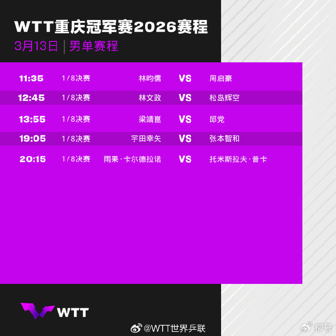 北京时间3月13消息,2026年WTT重庆冠军赛,CCTV5、CCTV5+直播比赛实况。这个比赛日,梁靖崑、周启豪两位中国选手出战。刚刚,全周启豪以1-3被林昀儒淘汰,而刚刚伤愈复出的梁靖崑将在13:55迎战德国名将邱党。另外,张本智和与宇田幸矢两位日本选手上演德比战(19:05)。