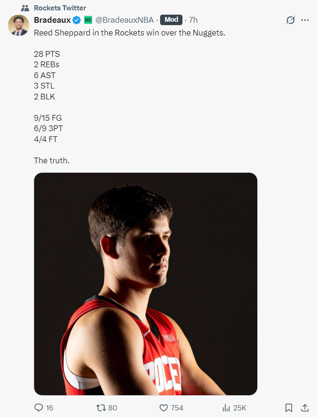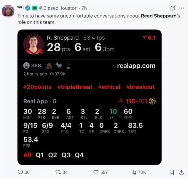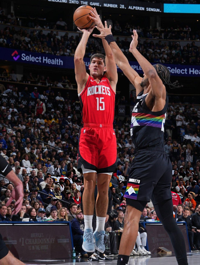 时间回到11月22日,火箭VS掘金的一番战,那场比赛的第二节谢泼德单节10中7,三分6中4,拿到18分1助攻2抢断,上半场谢泼德15分钟里11中8拿到20分2助攻2抢断,下半场阿德尔曼甚至采取了贴防一个二年级生的战略,此役谢泼德全场比赛27分。