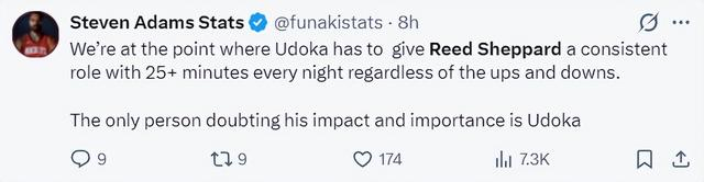 休媒:现在的情况是,乌度卡应该保证谢泼德一场至少有25+的登场时间,无论比赛的走势与谢泼德的竞技状态。唯一对他表现有影响的是乌度卡,乌度卡应该放下偏见了。
