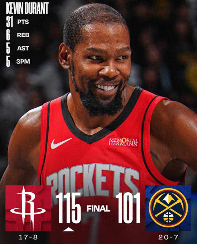 火箭VS掘金的三番战火箭队终于赢球了,前两次交手都是火箭惜败,G1火箭惜败3分,G2火箭惜败3分,而G2完完全全是被裁判吹输的,裁判报告说明一切,而这场G3火箭赢了掘金14分之多,凯文-杜兰特拿到31分6篮板5助攻5个三分球。
