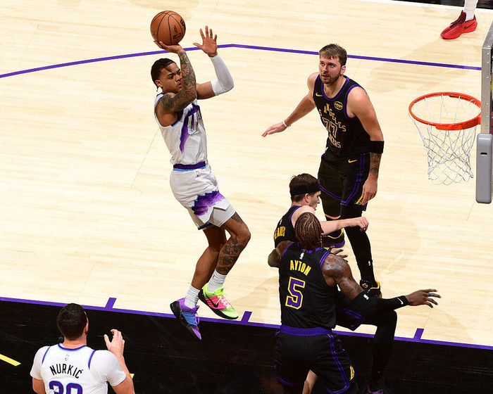 爵士开场外线手感火烫,湖人旧将米哈伊柳克先声夺人,盐湖城后场“少帅”基昂特-乔治火力全开,首节比赛结束时,主场作战的湖人在全员出战的情况下反而落后9分。