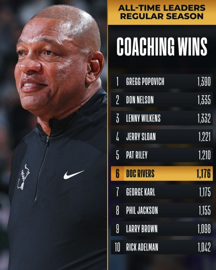 本场比赛过后,雄鹿主帅里弗斯的执教生涯胜场数来到1176场,超越乔治-卡尔,上升至NBA历史第六位,排在他前面的是帕特-莱利。