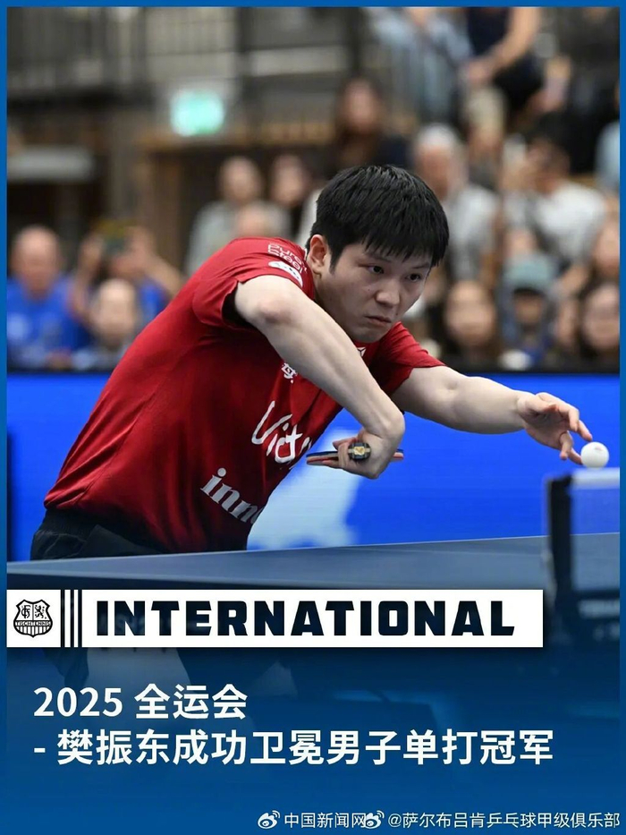 在樊振东卫冕男单冠军的第二天,德甲萨尔布吕肯俱乐部发文祝贺并宣布这位队内主将会在球队12月的三个主场比赛中出场。