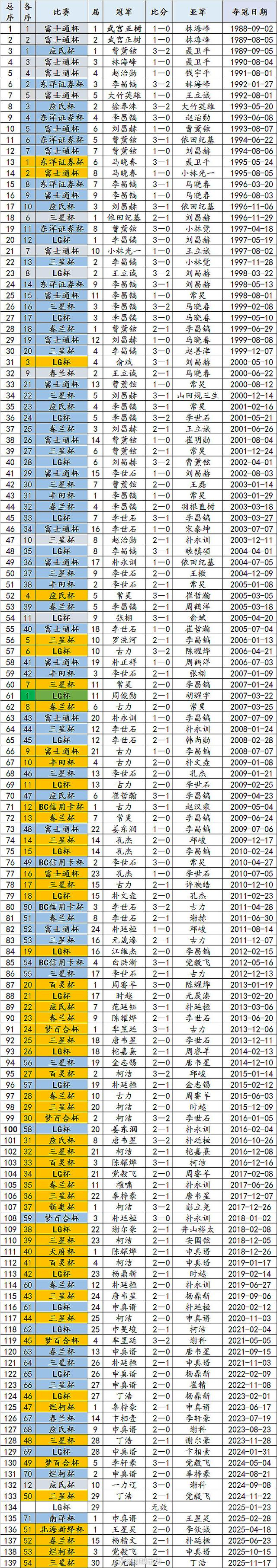 2025赛季,1月底的第29届LG杯决赛风波,成为围棋界永远的痛,韩国棋院擅自改动规则,将柯洁已经唾手可得的个人第九冠抢走。中国围棋协会不承认这次LG杯的决赛结果,随后中国队也集体抵制了第30届LG杯。整个2025年,王星昊2月在首届南洋杯决赛中0-2输给申真谞,但随后王星昊首届北海杯夺冠,杨楷文、党毅飞先后在第15届春兰杯和第3届烂柯杯决赛中战胜韩国劲敌登顶,11月的第30届三星杯廖元赫与丁浩包揽冠亚军。