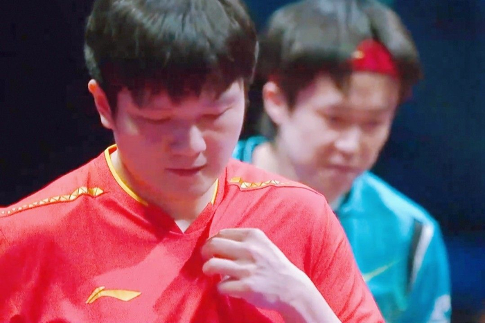比赛是非常激烈的。第二盘王楚钦输给樊振东,一个关键球的失误,让大头把自己的“大头”往球台上磕,好懊悔啊。