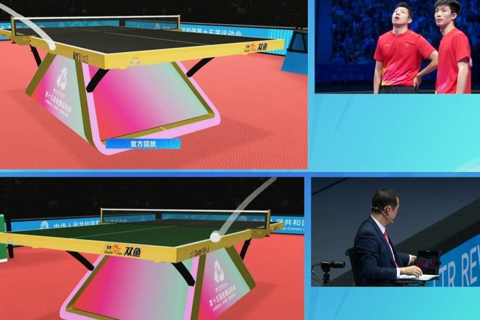 比赛是认真严谨的,第一盘双打出现鹰眼挑战,上海组合许昕/周恺挑战对手黄友政/马龙不是擦边,成功。