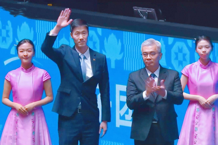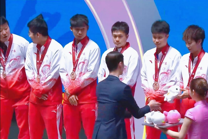 中国乒乓球界常年身材保持最佳的乒协主席王励勤,为获奖队伍一一颁发了第十五届全运会吉祥物玩偶。