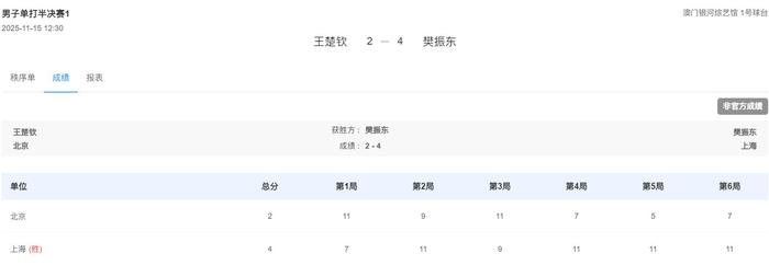 11月15日中午,全运会乒乓球男单半决赛,王楚钦VS樊振东、袁励岑VS林诗栋。