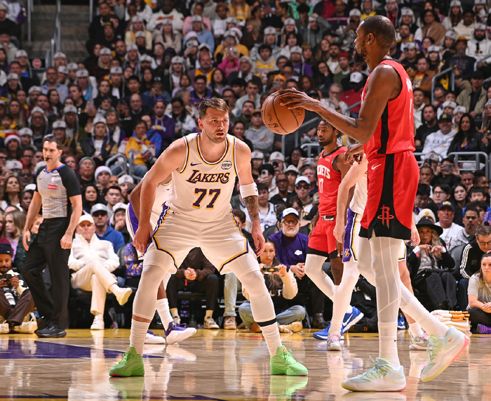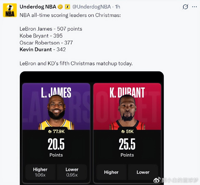 37岁的杜兰特VS41岁的勒布朗,两位超级巨星的年终大战看点十足,詹姆斯是年终大战得分榜第一(第20场),杜兰特是是年终大战得分榜第四(第13场)。开场杜兰特的手感一般7中3+三分2中1拿到7分1篮板2助攻1盖帽。