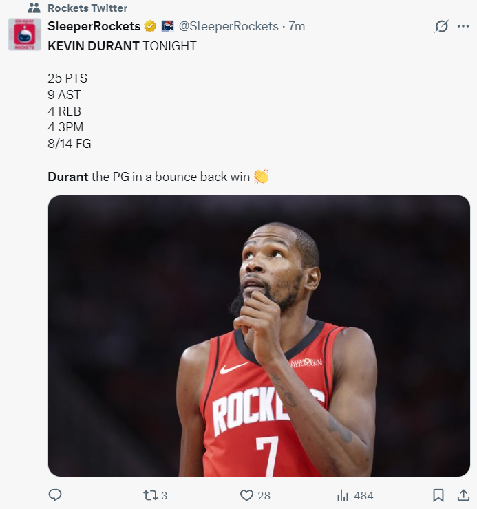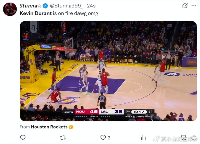 休媒晒出杜兰特的数据写道:杜兰特打一号位带领火箭赢得比赛。