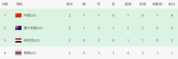 北京时间1月11日晚上,2026年U23亚洲杯正赛首轮继续进行,D组两场比赛,中国男足1-0战胜澳大利亚男足、泰国男足1-1绝平伊拉克男足。这样,中国队积4分升至小组第一,澳大利亚队、伊拉克队、泰国队分列第二、第三、垫底。