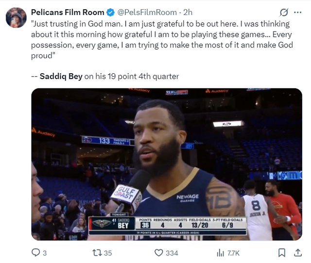 萨迪克-贝32分钟,拿到36分4篮板4助攻1抢断(末节19分);鹈鹕队末节打出40-26的浪潮多亏了萨迪克-贝。