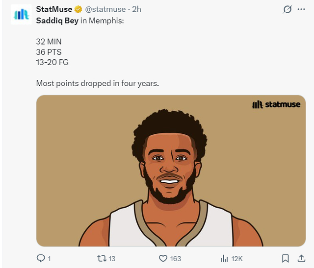 这场比赛萨迪克-贝打出了鹈鹕生涯最高光的一场比赛,32分钟,20中13,三分9中6,罚球4中4,拿到36分4篮板4助攻1抢断0失误,命中率65%,三分命中率66.7%,真实命中率82.7%,正负值+5。