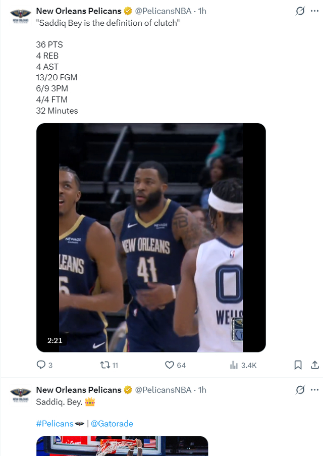 新奥尔良鹈鹕队晒出萨迪克-贝的数据后为他戴上了皇冠,换言之鹈鹕官方也认证此役他是第一功臣。