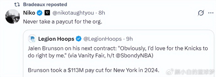 美记Niko评价布伦森的言论:永远不要为了这些球队组织选择降薪。(他暗示布伦森被尼克斯坑惨了)