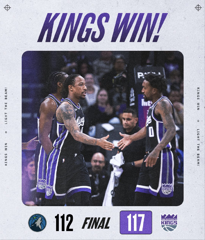 才复出打了两场的基根·穆雷大爆发,出战44分钟,19投10中,三分5中3,罚球3中3,砍下26分14篮板2助攻2抢断,篮板创个人生涯新高。蒙克发挥出色,出战26分钟,投篮18中9,其中三分7中2,罚球2中2,得到22分2篮板2助攻,正负值+15。末节比赛,单节轰下13分,助国王拖进加时,成功逆转。