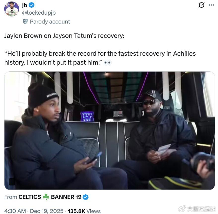 队友布朗也在直播中透露:“他可能会打破跟腱康复速度的历史纪录,我不会排除这种可能。”