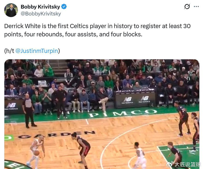 同时根据队记Bobby Krivitsky统计,怀特凭借这样的表现成为凯尔特人队史首位单场至少交出30分5篮板5助攻4盖帽的球员。