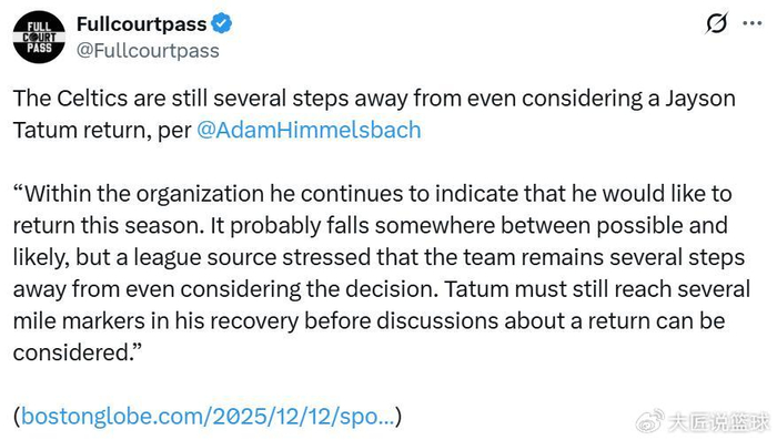 先是《波士顿环球报》记者Adam Himmelsbac曝出,塔图姆本人非常希望本赛季复出回归。