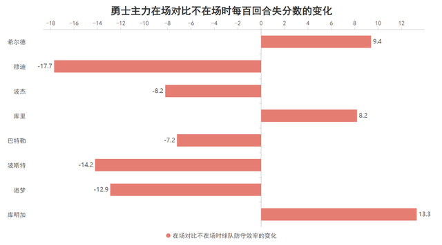 再看八名主力在场对比不在场时带给勇士防守效率的变化,穆迪可以令勇士每百回合减少17.7的失分,库明加可以令勇士每百回合增多13.3的失分,这些可以表明在场对勇士防守提升最大的是穆迪,伤害最大的是库明加。