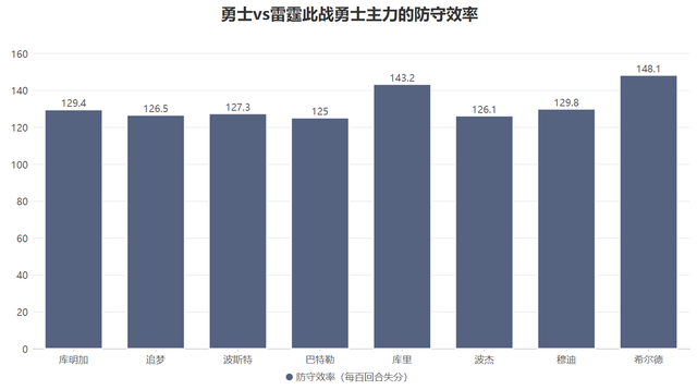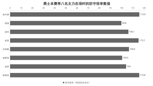 那么勇士到底是谁在不防守+有私心呢?本赛季勇士的八名主力在场时防守效率数值最低的是穆迪是99.8,最高的是希尔德的115.9,这意味着当穆迪在场时勇士每百回合的失分数最少,希尔德在场时勇士每百回合的失分数最多;