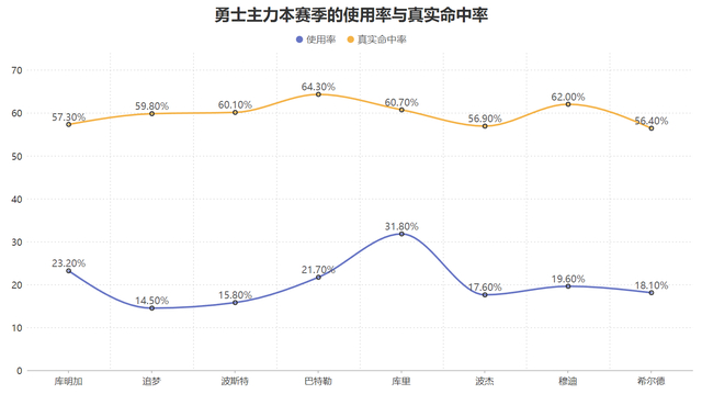 那么有私心代表什么呢?可以理解为个人的数据发展大于球队的胜负,本赛季勇士八名主力里使用率最高的是库里与库明加,这意味着此二人消耗了球队最多的出手机会,同时穆迪与库里有着最高的结合三分罚球情况的真实命中率,消耗出手机会更多单独来看并不是错误的,如果得分效率不足才值得诟病。