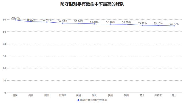 从防守效率来看勇士并没有想象的那样不堪,但同时在勇士的防守下对手结合三分情况的运动战也就是有效命中率达到了54.7%,这个防守时对手的有效命中率位于联盟第11高,这意味着勇士在防守对手时对手的运动战命中率达到了更优的水准,在这一点上勇士显然是联盟的下游级别,这也可以表明勇士虽然能减少失分数却无法令对手投出更低的命中率。