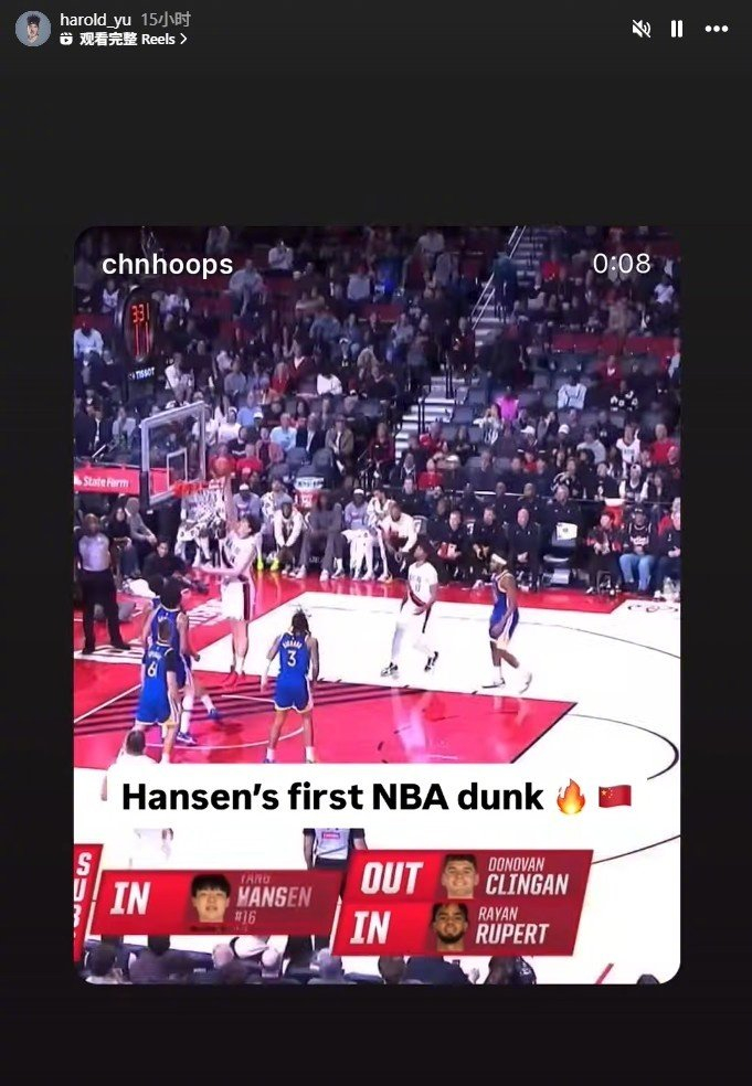 #余嘉豪转发杨瀚森NBA首次扣篮# 杨瀚森在昨天开拓者对阵勇士的比赛中,完成一记单手暴扣,拿下NBA生涯首个运动战得分,余嘉豪也在社媒转发了杨瀚森NBA生涯首次扣篮的视频!