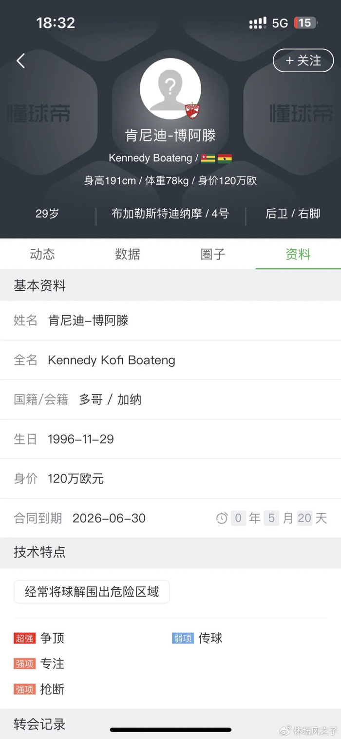而布希里也基本被球队放弃,泰山队将引援目光聚焦在了多哥中卫肯尼迪·博阿滕身上,博阿滕今年29岁,正值职业黄金期,身高达到191cm,体型强壮,正面防守能力极为出色,是典型的中后卫“好苗子”,2023赛季,博阿滕效力于罗马尼亚甲级联赛布加勒斯特迪纳摩,他展现出了惊人的稳定性,20场比赛全部首发且打满全场,堪称球队的后防中坚。他踢球风格彪悍,在防守时犹如一堵移动的城墙,让对手难以逾越;在进攻端,他也能凭借出色的身体素质和头球能力,为球队创造机会。他甚至自称“野兽”,可见其对自身实力的自信。