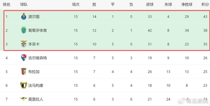 截至目前,本轮葡超的比赛已经全部结束,加上葡萄牙体育,葡超传统3强都拿到了3分,积分榜上的形势,也没有发生变化。如今波尔图依然排名第一,他们领先葡萄牙体育5分,而本菲卡则落后榜首8分,目前位居第三。