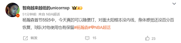 正如欧洲篮球专家王健所说,杨瀚森首节5中5可以随便打,因为太阳根本没内线,杨瀚森在身体还没有百分百恢复的情况下打得非常轻松,球队对杨瀚森的使用也有所保留。