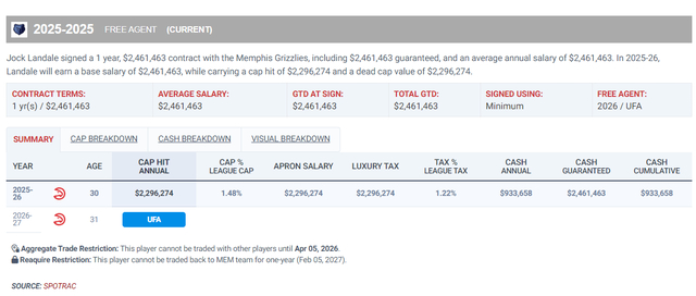 这场比赛我觉得最惊艳的是乔克-兰代尔这位澳大利亚中锋,他去年夏天跟灰熊签下一份1年246万的底薪合同。他是2023年夏跟火箭签下一份四年3200万的合同,第二年是部分保障,第三年与第四年是不保障,所以在去年夏天火箭裁掉了他。