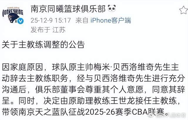 CBA新赛季还没有拉开大幕,就有球队更换了主帅,南京同曦方面官宣,由于贝西诺维奇个人原因辞职,王世龙成为南京同曦新任主帅,不过根据媒体报道,南京同曦方面是不满意贝西诺维奇在CBA俱乐部杯的表现,后续沟通不理想导致了。